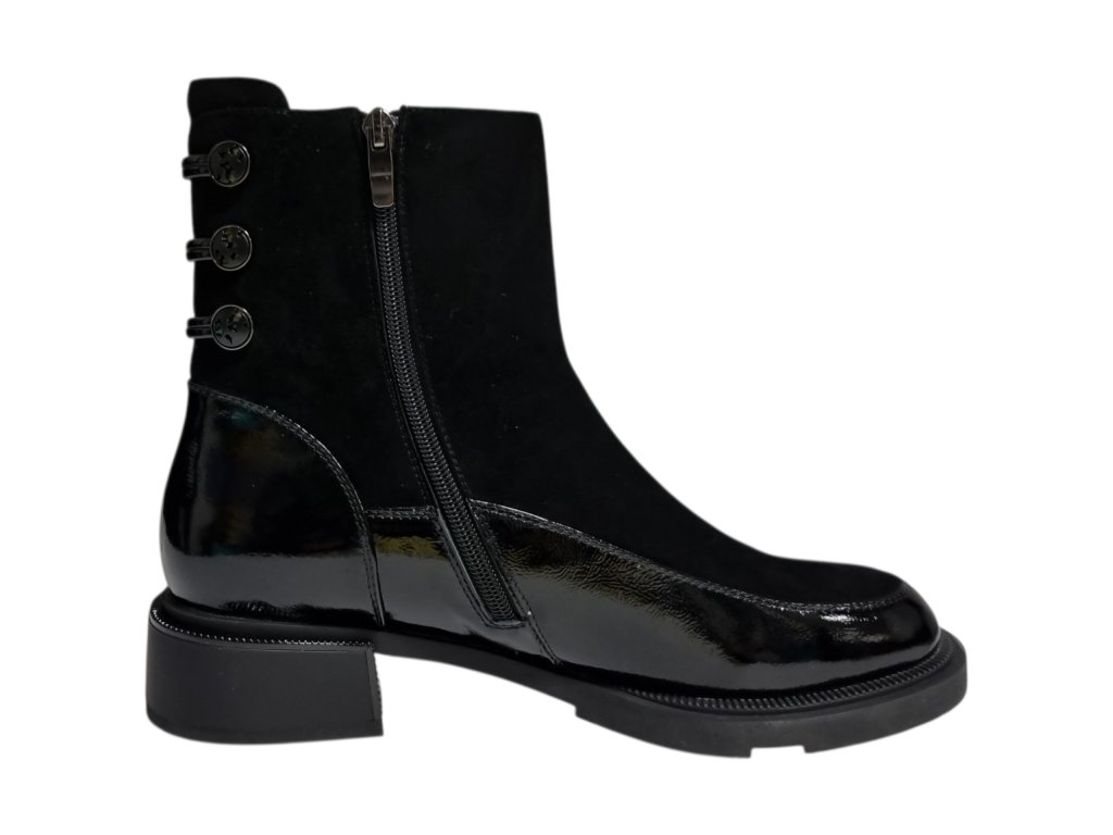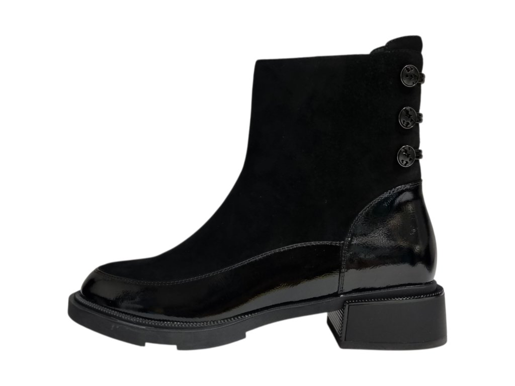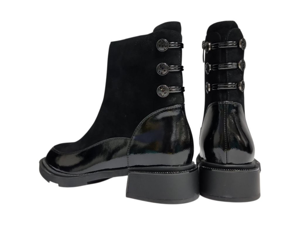 Dámská kožená obuv značky Ladies je vysoce kvalitní podzimní a zimní obuv vyráběná z lakované telecí kůže v kombinaci s černým kozím semišem. Krásně se přizpůsobí tvaru nohy, obuv je tedy pohodlná a zároveň. Důležitou vlastností je i menší propustnost vlhkosti. Tyto kožené dámské kotníkové boty jsou vhodné pro chůzi ve městě po pevném povrchu, zároveň se však hodí i na chůzi v přírodě.