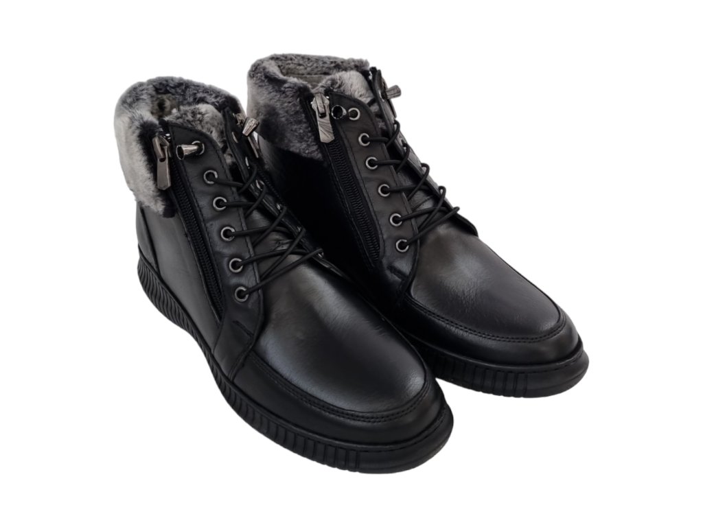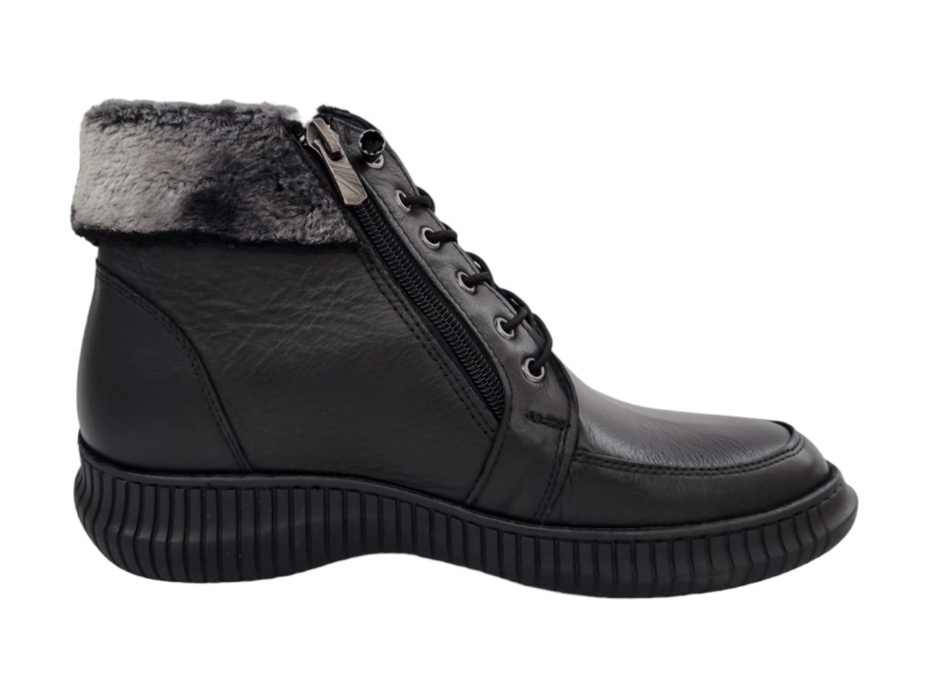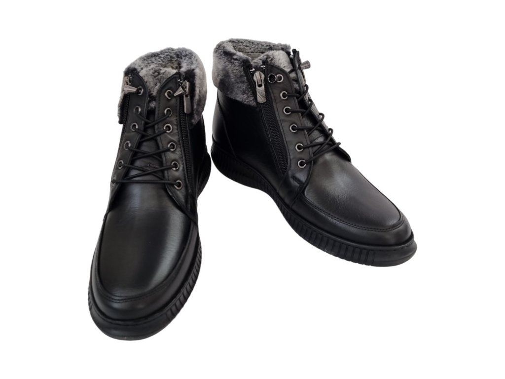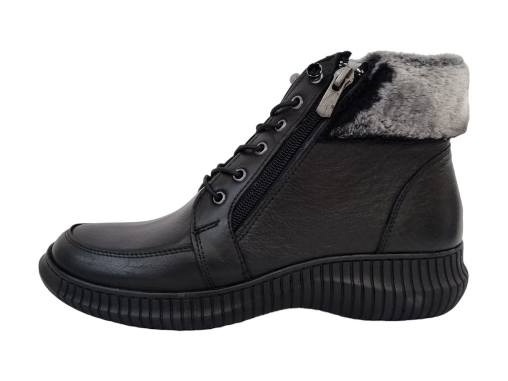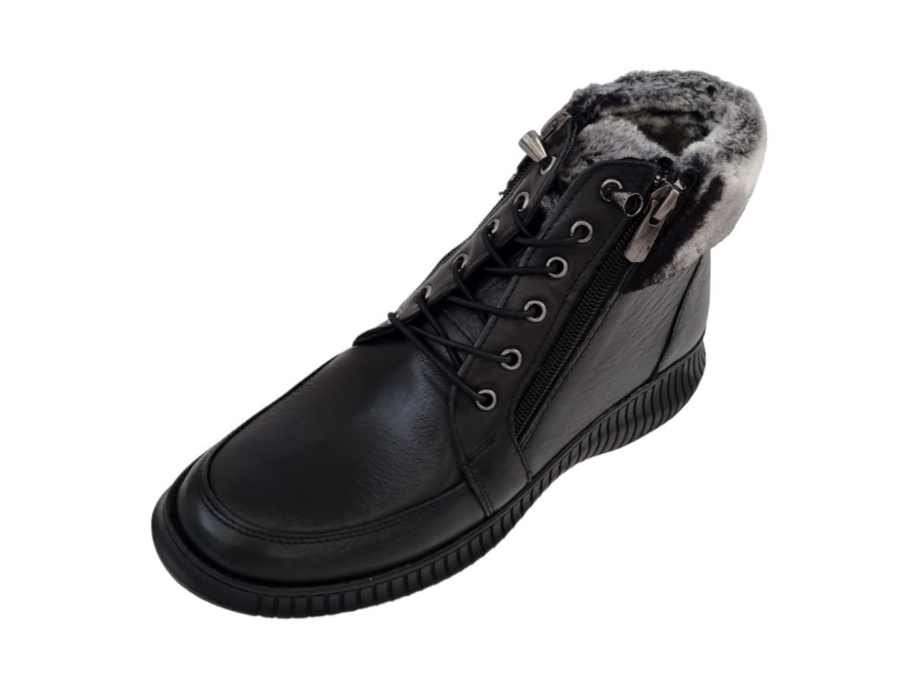 Elegantní černé kotníkové boty z pravé kůže značky Urban Ladies spojují styl a maximální pohodlí. Uvnitř jsou zateplené hřejivým kožíškem, který zároveň tvoří měkký límec ohrnutý přes horní okraj boty – působí efektně a chrání kotníky před chladem. Praktické šněrování na pevnou kulatou gumu s kovovými konci doplňují dva funkční zipy po stranách, díky nimž botu snadno obujete i vyzujete bez nutnosti rozvazování. Robustnější podešev zajišťuje jistý krok a skvělou stabilitu i v chladném počasí. Vnitřní kožená stélka zaručuje prodyšnost a příjemné klima i při delším nošení. Pevná podešev poskytuje jistotu kroku a chrání před chladem.